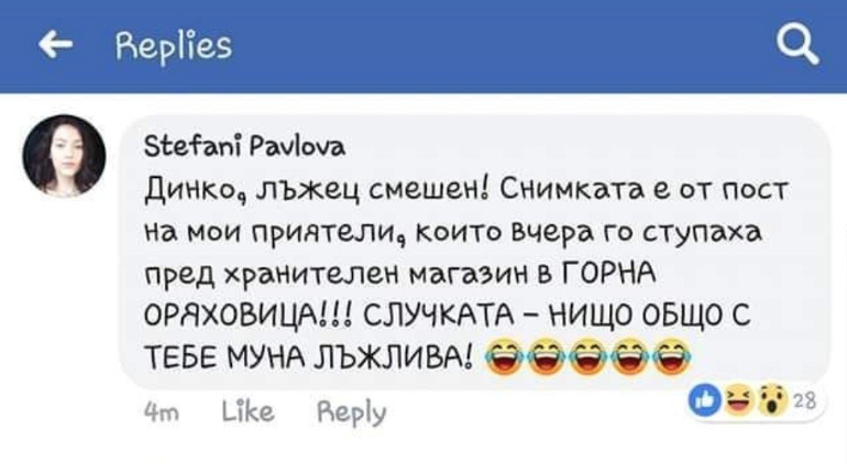 „Динко, лъже смешен! Снимката е от пост на мои приятели, които вчера го ступаха пред хранителен магазин в ГОРНА ОРЯХОВИЦА. Случката няма нищо общо с теб, маймуно лъжлива“ информира Стефани Павлова във Фейсбук.
