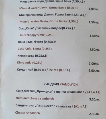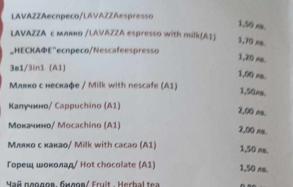 Както може да се види от снимките – цените са народни. Минералната вода, в зависимост от това дали е малка и голяма, е 1 лев или 1,50 лева. Кафетата са от 1 до 2,50 лева. Газираните напитки също струват нищо и никаквите 1,5 лева.