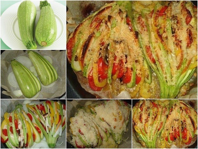 Тиквичките нарежете по дължината в чиния, но не до края – трябва да се получи нещо като ветрило. Зеленчуците, месото и гъбите нарежете на произволни парчета